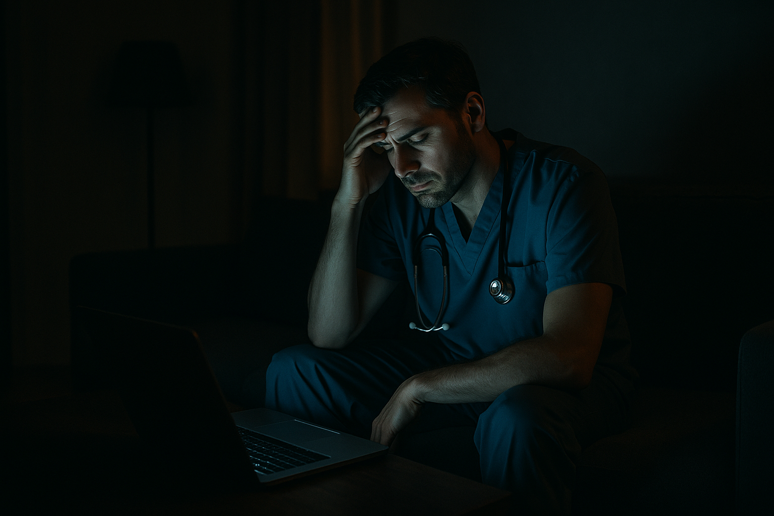 Three shifts later, he walks through his front door, locks it behind him, sits on his couch, and opens his laptop.